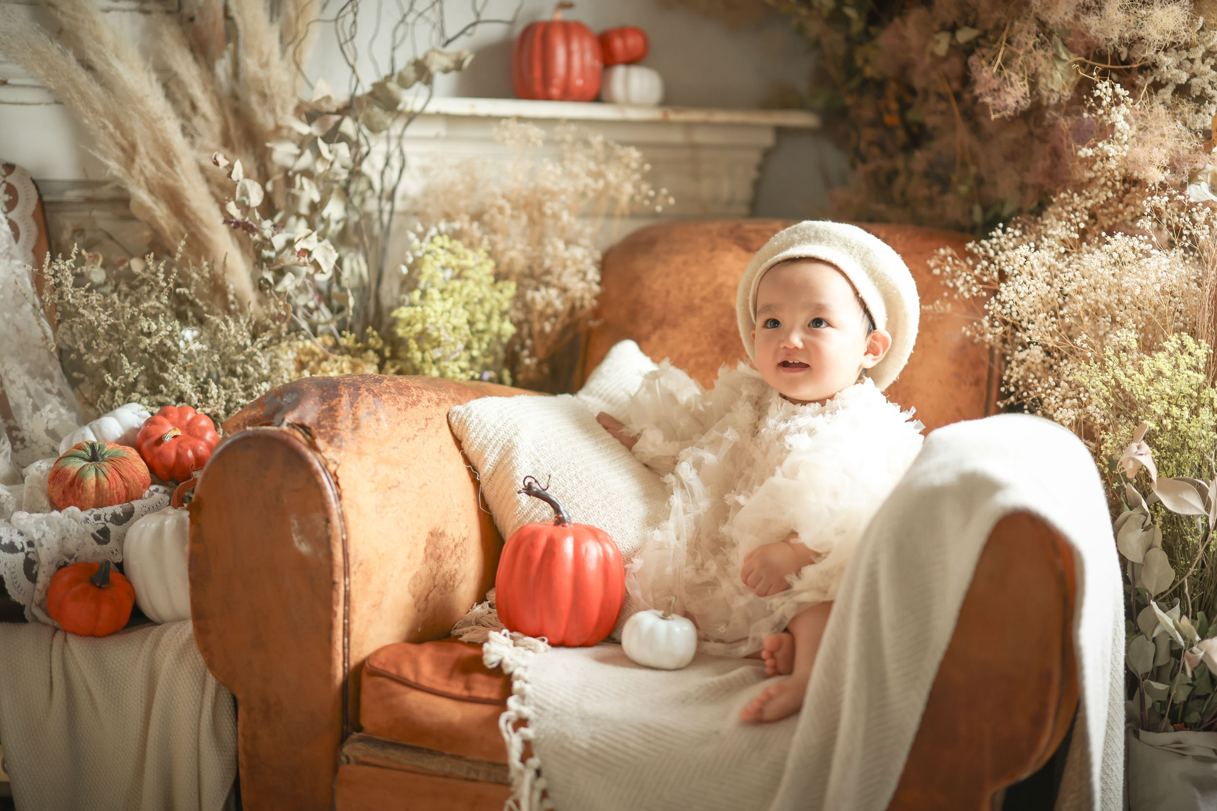 ブラウンと白を基調としたな空間にアクセントカラーのかぼちゃが引き立つ温かみのある空間でのハロウィンフォトはいかがですか